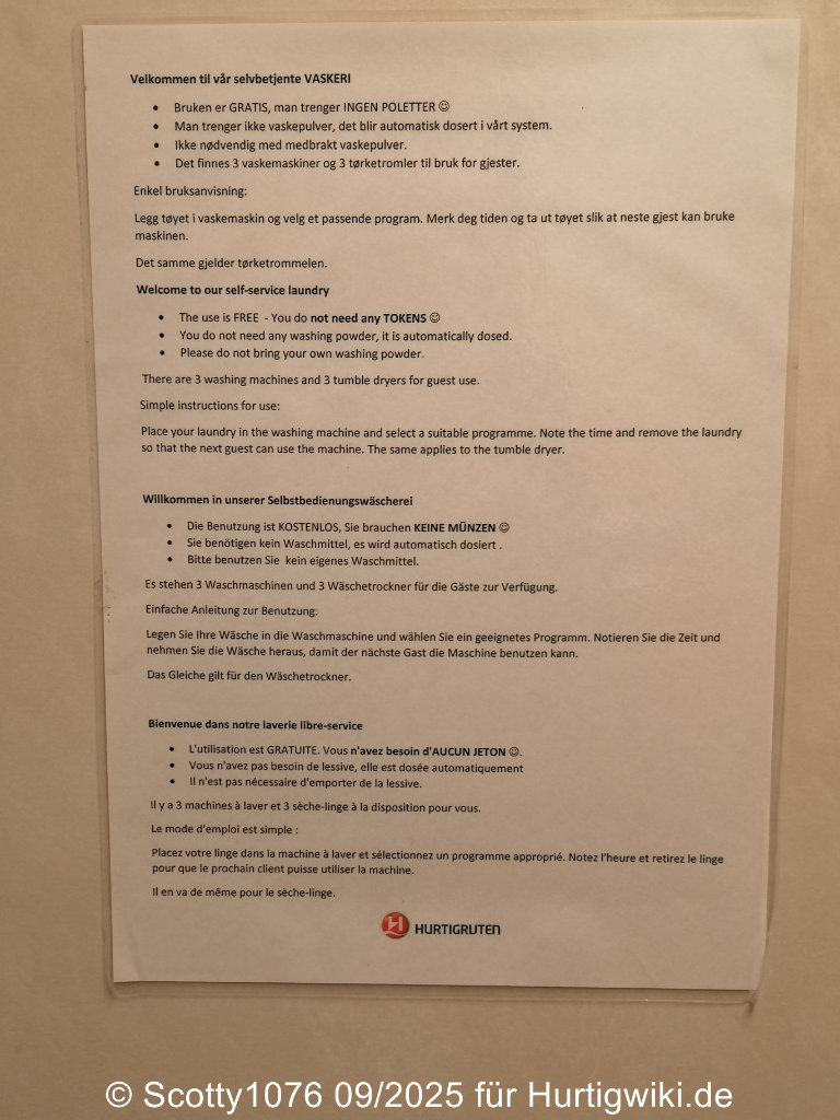 „… Die Waschmaschinen bei Havila verfügen über eine automatische Waschmittelzugabe, ich glaube nicht, dass man ein anderes Waschmittel zugeben kann. Das Waschen kostet nichts. Die Waschmaschinen sind oft belegt, es fahren also viele mit, weil man umsonst waschen kann?