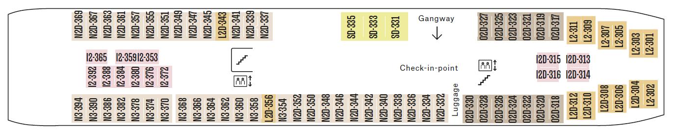 - 15 POLAR Außenkabinen der Kategorie J - 8-11m², 2 bis 3 Betten/Bettsofa oder Doppelbett, Bad mit WC/Dusche, eingeschränkte oder keine Sicht, 9 x J3 an Backbord, 6 x J2D an Steuerbord;